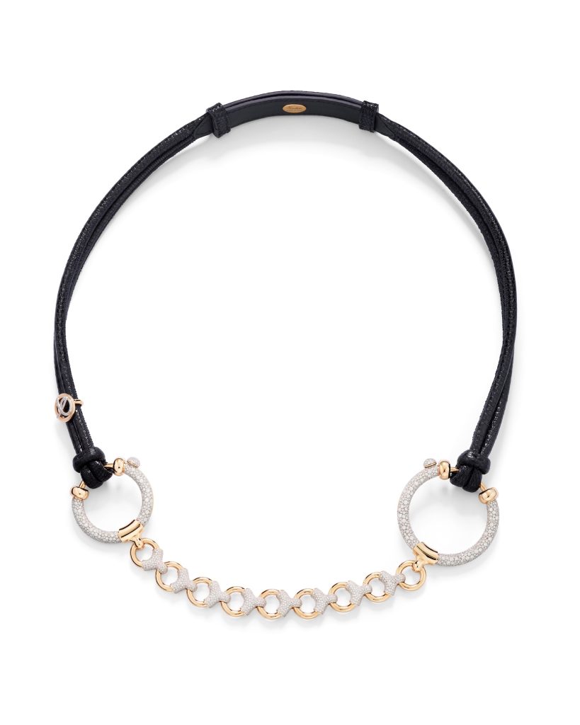 「PRECIOUS SNAP HOOK」– 此款玫瑰金结绳型项链堪称建筑美学的典范之作,以错落有致的链节设计重现90年代女性力量风潮,淋漓尽致地展现品牌精湛的钻石镶嵌工艺。匠心独运的可拆卸式双扣头设计,提供两种截然不同的佩戴方式;流动的修长链身可随心变幻为双链叠戴、结绳型项链或苏托尔项链等多种造型,诠释品牌对多元美学与当代优雅的执着追求。整条链饰以密镶钻石点缀,璀璨宝石沿黄金表面蜿蜒流转,宛若自然生长的光之轨迹。每一处细节都彰显着Pomellato宝曼兰朵将建筑几何与柔性力量完美融合的造诣,成就这件兼具力量感与流动性的珠宝杰作。Fine modulo