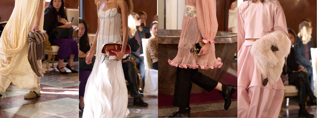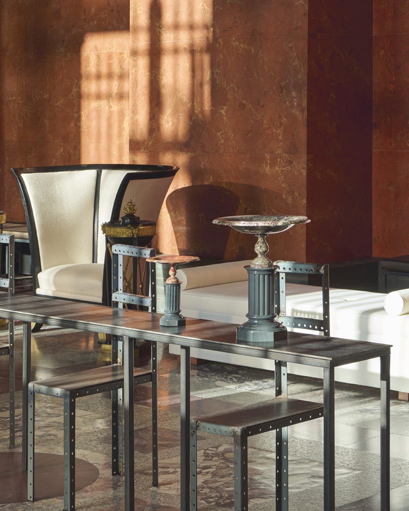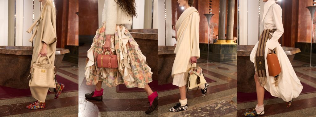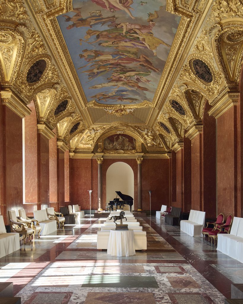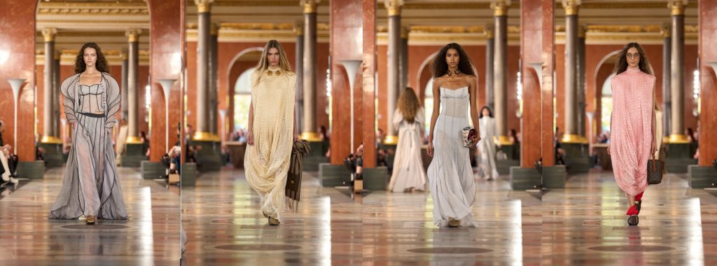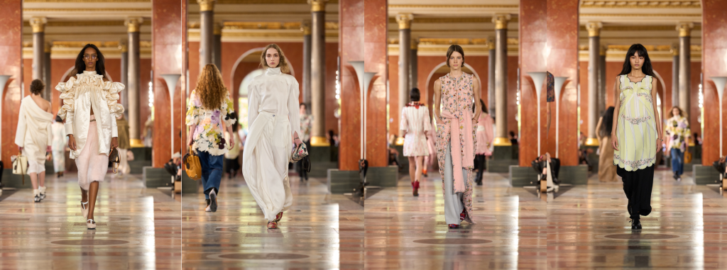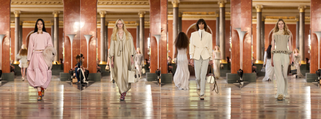 路易威登2026春夏女装系列揭幕于旧时法国国王,路易十四之母安妮王后的夏宫?舞台布景由设计师Marie-Anne Derville打造,焕发当代格调,跨越多个时代的一系列家具和艺术佳作:包括艺术家Robert Wilson的创作?18世纪家具设计大师Georges Jacob的杰作?1930年代由Michel Dufet设计的装饰派艺术风格座椅?19世纪陶艺家Pierre-Adrien Dalpayrat的雕塑作品及她亲自设计的家具,呈现一场徜徉于18世纪至今法式美学的沉浸式体验?