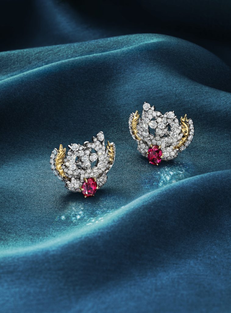 灵感源自让·史隆伯杰一系列妙趣横生的??卣肷杓疲ㄎ韬?ˋnemone)主题作品洋溢着灵动韵律与绮丽妙想。该系列中的焦点之作是一款华美的项链,充满雕塑感的黄金元素与璀璨钻石交相辉映,三颗总重近5克拉、未经优化处理的红宝石则进一步为作品注入鲜活生命力。这些红宝石均产自非洲莫桑比克的知名矿区,非凡的色泽与品质令它们宛如灵动舞者般在项链中流转生姿。