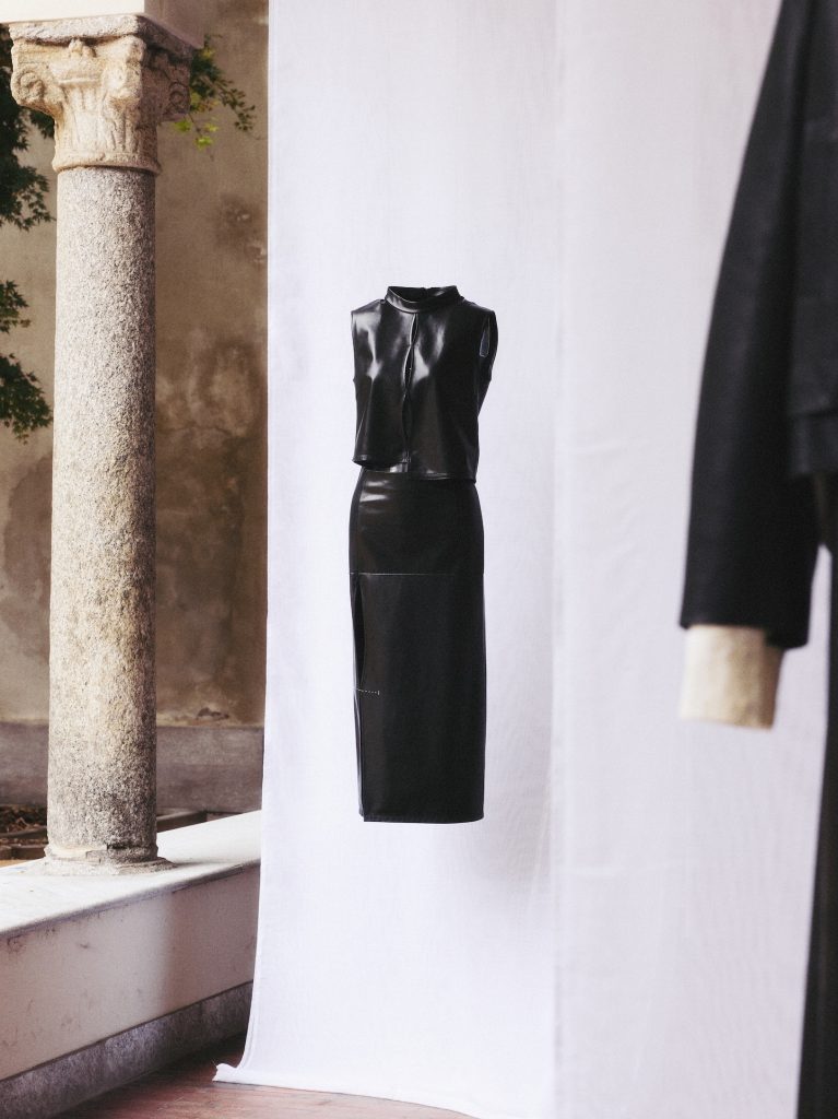 色彩叙事之外,本系列以当代视角重塑面料与廓形,凝练现代美学精髓,彰显品牌基因中深厚的意大利匠心裁艺。服装廓形融合了建筑般的线性结构与当代极简的流动气息,在精准剪裁与自在穿着间取得巧妙平衡。天然亚麻、纸皱感印花棉与甄选丝绸如夏日海浪般轻抚身体;皮革则以轻盈柔软之态,给予身体无拘束的穿着体验。意大利纸皱感泡沫印花——点点斑驳的淡米色调在温润的象牙白织物上晕染点缀,如岁月沉淀于珍本书页,到宛如星辰点缀夜空的纯白纱线与细密刺绣,不同质感交织共鸣,展开一场静谧而有力的对话。